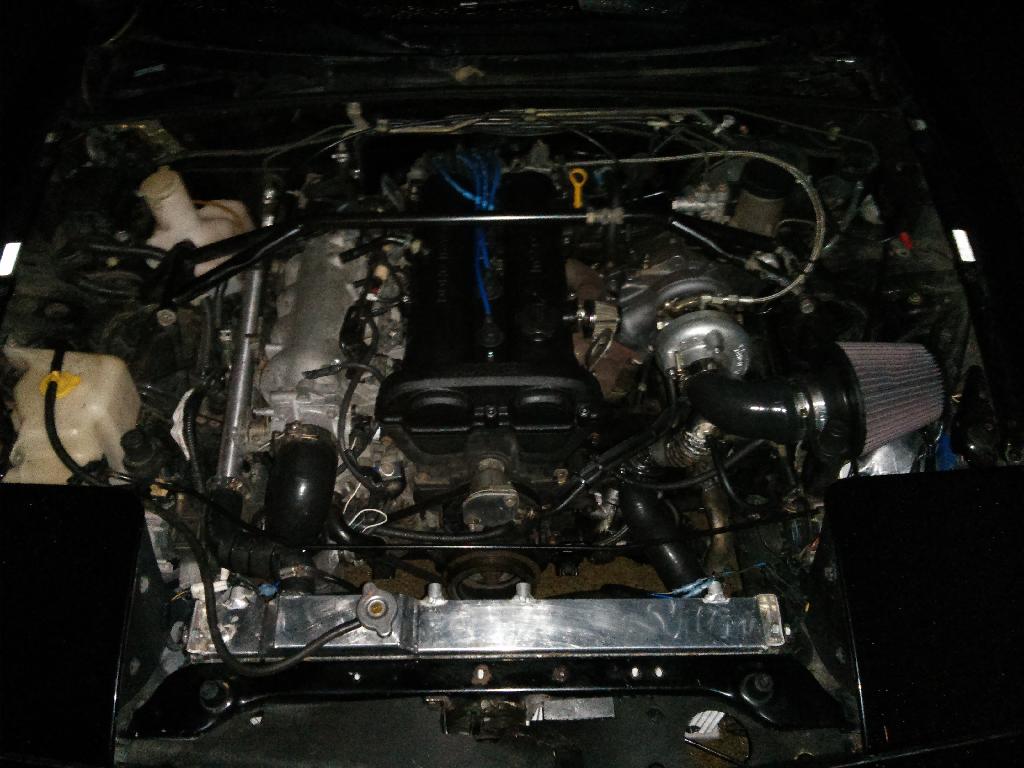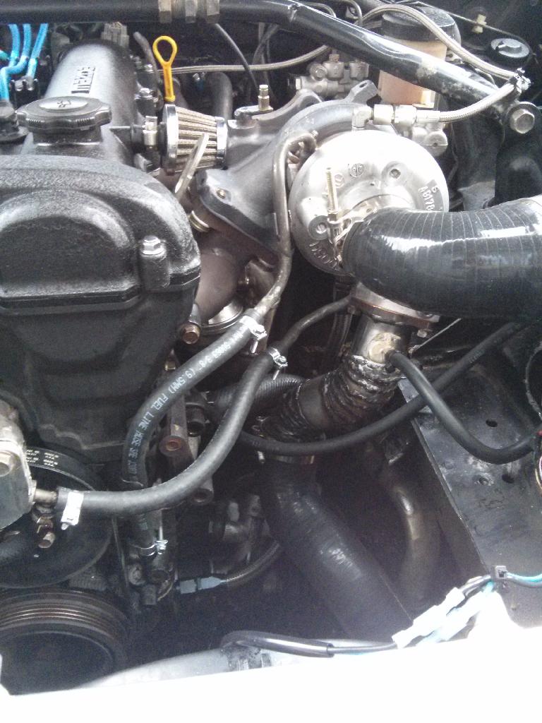 Well it's been a while since I have updated this, I got a rollbar, added a harness bar with DOM tubing, removed A/C and PS, installed a new 14b turbo with 7CM housing, routed the EWG to a screamer pipe. I adapted the stock eclipse hard water lines to the car. They aren't super pretty but it keeps the rubber away from the turbo!