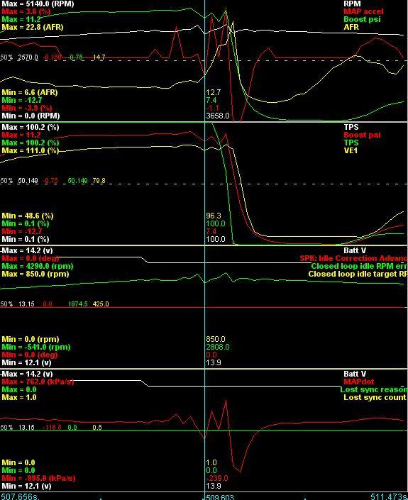 more boost , backfire (I think) and now it idles at 2k. no manifold leaks, BOV is closed, map reads what I believe to be correct. any Ideas? in the pic you can see the boost spike, then rpms fall, then idle at 2k.