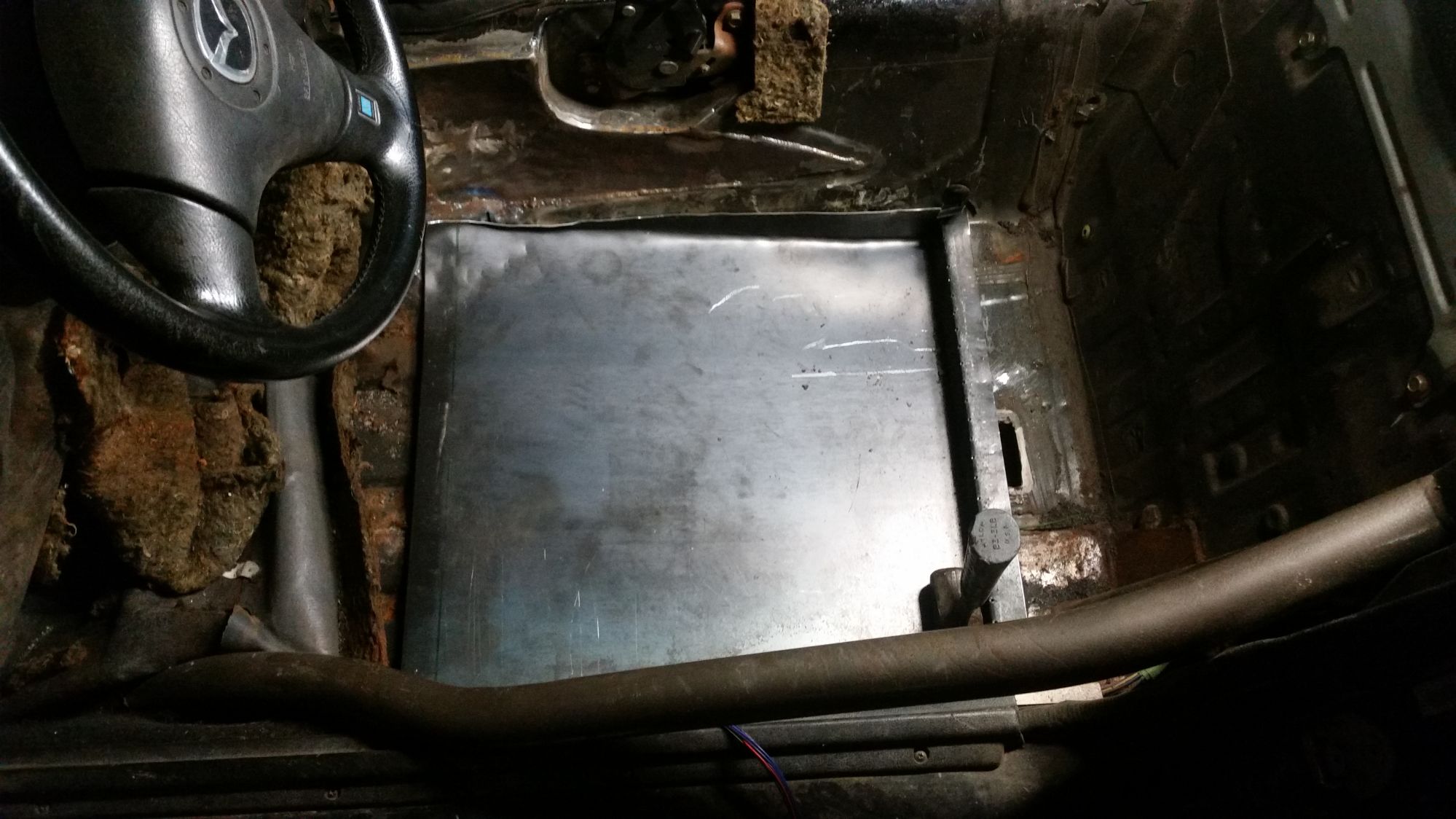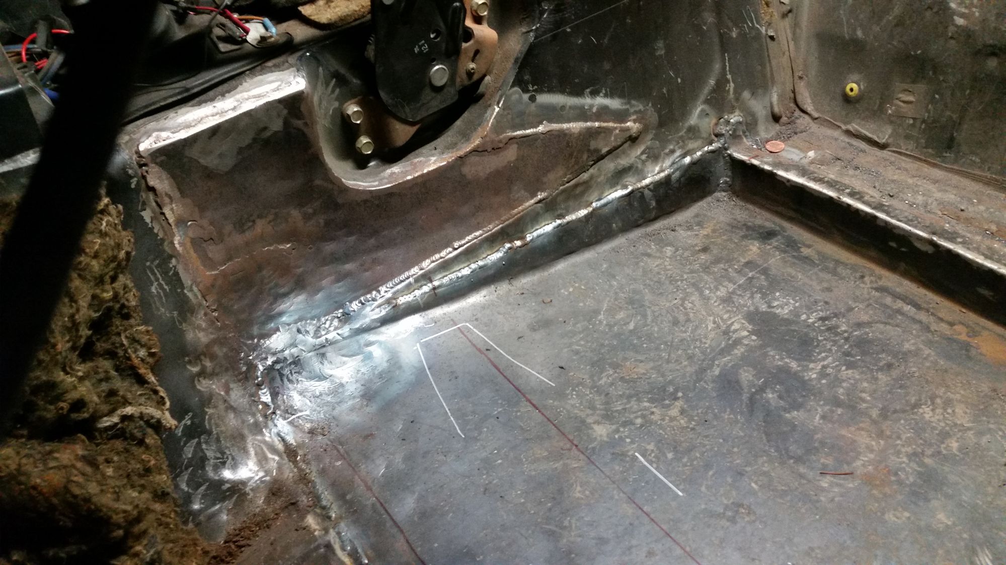This is the new floor welded in place. As you can see, I had to remove a lot of material, and smash the rest with a hammer. This seat is just so big in the worst spots. The side rail-lip-thing that runs all around the perimeter of these seats, caused most of the problem.