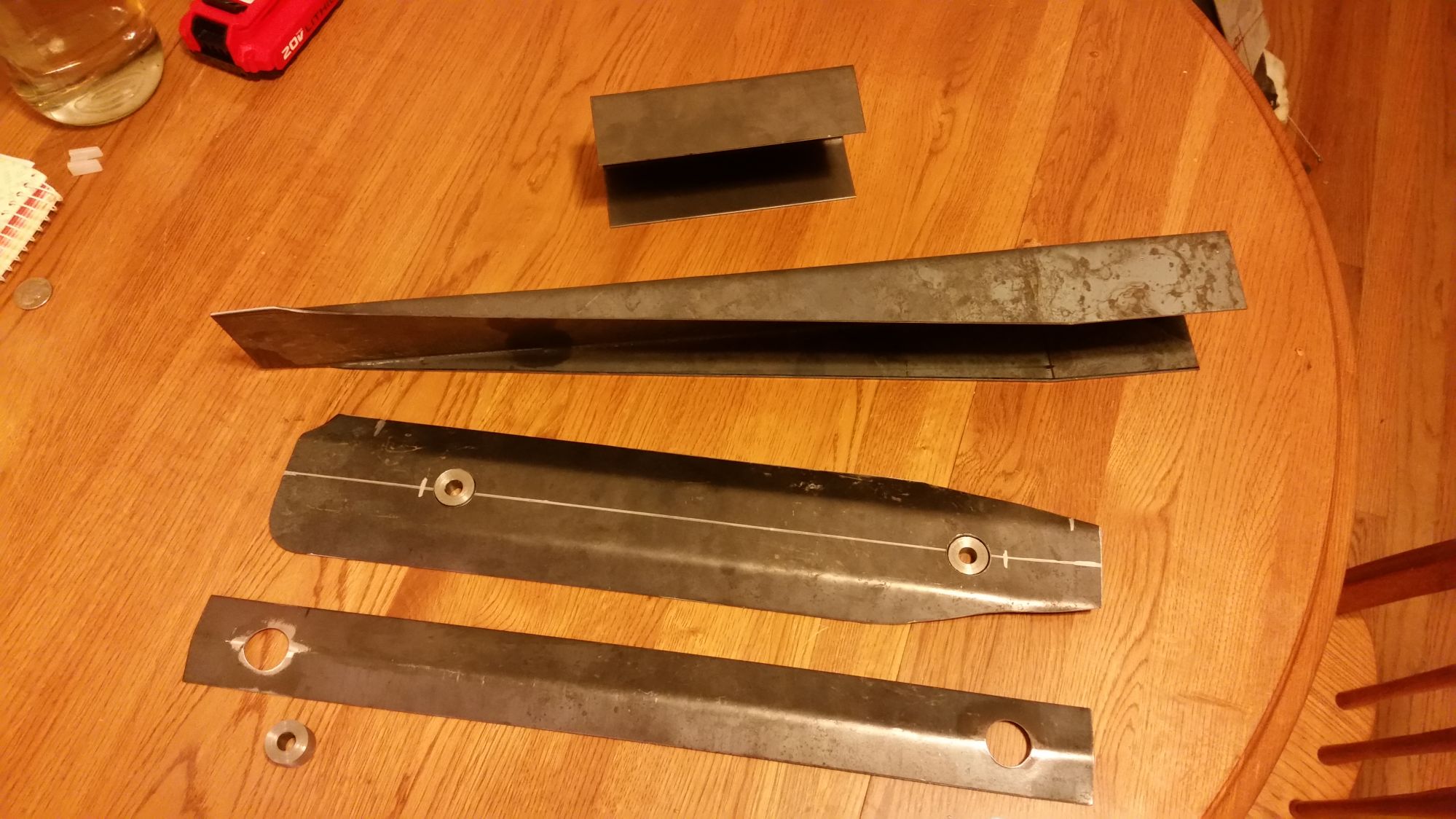 Some assorted parts. The wedge thing will replace the missing section of the frame rail I had to remove. The floor is already really solid, and the car has an 1-3/4" chromoly cage. Not too worried about flex, but F it. MOAR STIFF.