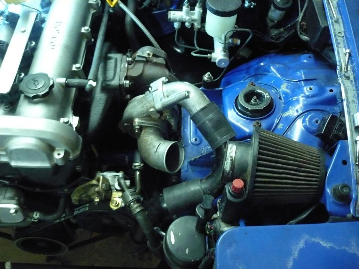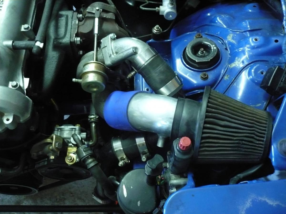 I'm really surprised you didn't just clock the turbo straight down! It's easy to route under neath the p/s when there is no a/c in the way.