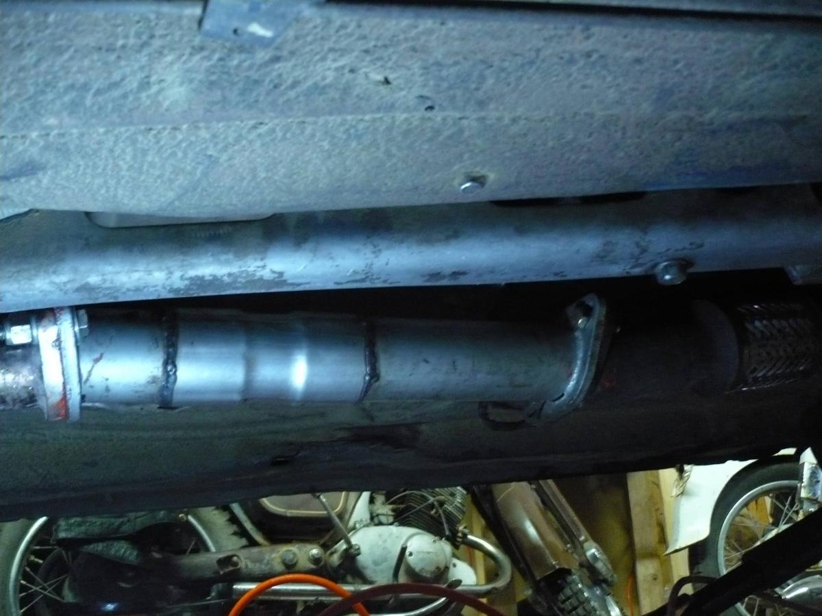 Test pipe in place, exhaust hooks up perfectly. Well almost perfectly, I had to bend a hanger, but it works beautifully with no rubbing or anything. Note that the ID of that test pipe is 2.5" all the way through, even the added part. The way he added the extra 1.5" makes it look like the pipe is "choked" down in the middle, but it isn't. 100% smooth flow.