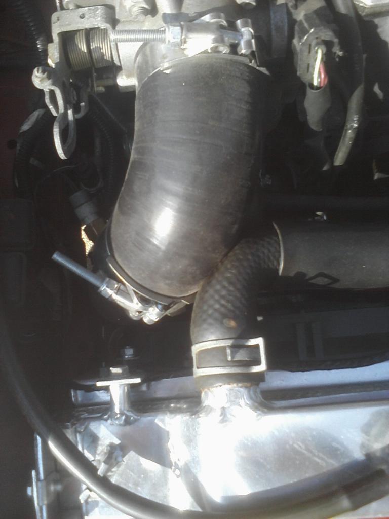 First I got this charge pipe welded up with my BOV flange earlier this week. Today I drilled/tapped it for a nipple. This is where I'm going to source my wastegate boost signal from, its POST intercooler. Bleh pic sucks, but you get the point.