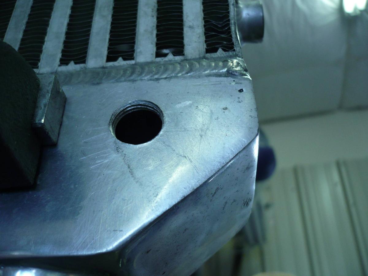 Next I went ahead and pulled the FMIC. I drilled/tapped the coldside endtank for my IAT sensor. Then I JB welded that ****** in place. I do not foresee any issues with this.