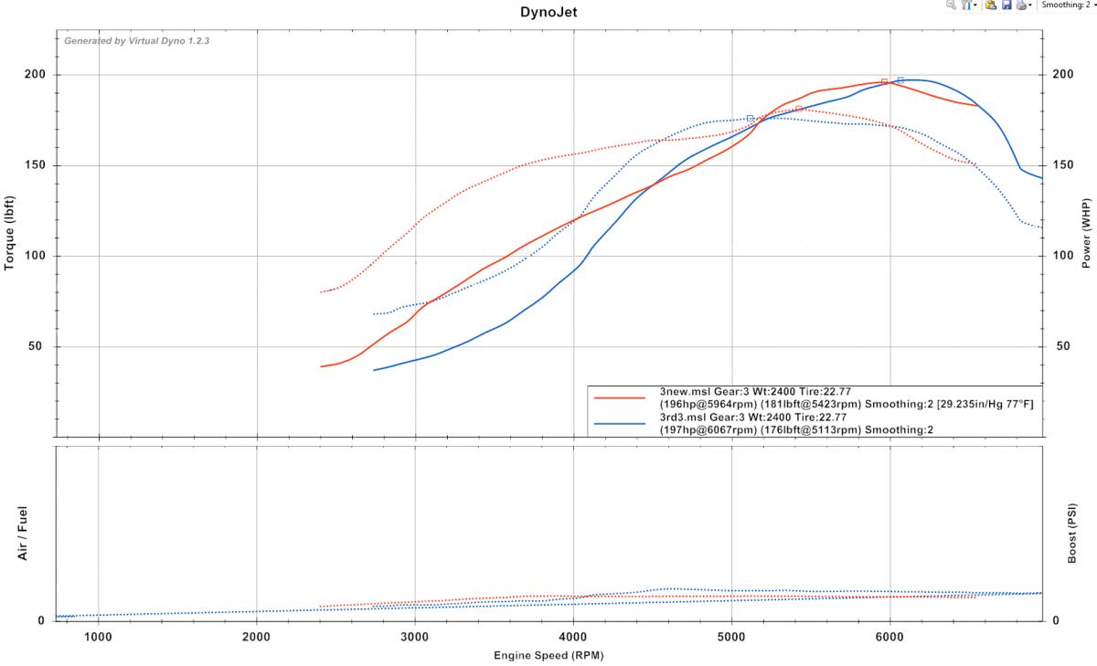 The old greddy setup was peaking at 184kpa and falling to 160kpa by redline. The new setup is 145kpa and dropping to 140kpa at redline.
