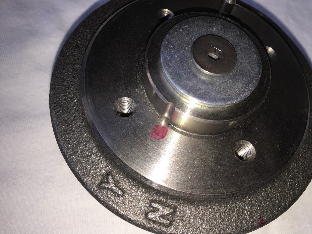 Had to end mill down because no flat surface. Then drilled the through the boss and touched on the timing pulley. Next the stack could be separated. Drilled the holes into the face of the timing pulley for 2x 1/4" pins to be pressed in but still leaving ~.100" before breaking through.