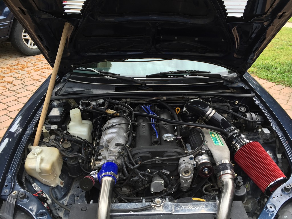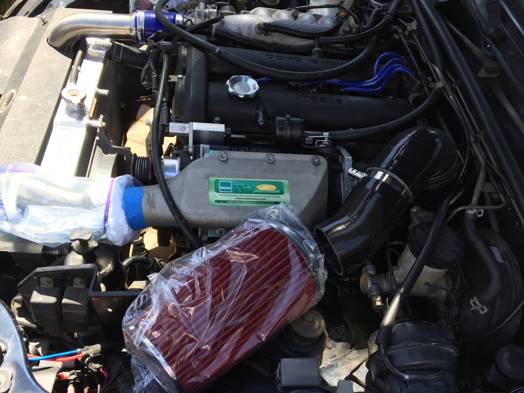 I just got the blower back on yesterday. Did some upgrades. I adapted a stock Mustang throttle body to the blower (65mm). Installed a huge air filter and 3" hose from filter to throttle. Finally has the 14psi other's with my pulley sizes get. Highest previously was 11.5. The stock Miata throttle and intake parts that came with the blower were obviously restrictions. The old intake and filter will literally fit inside the new stuff. Car feels good.