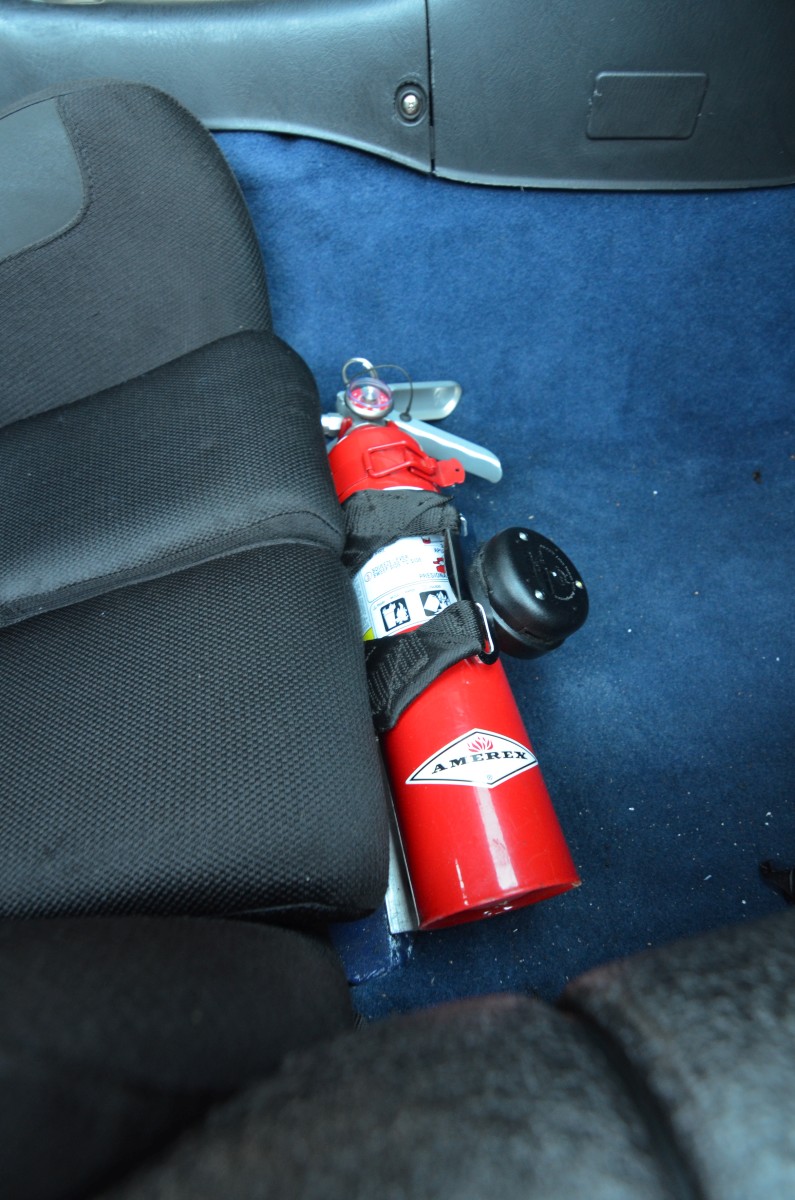 A while back I made a fire extinguisher bracket that bolts into the oem front passenger seat rail mounting holes. This is just a simple ABC 2.5LB unit.