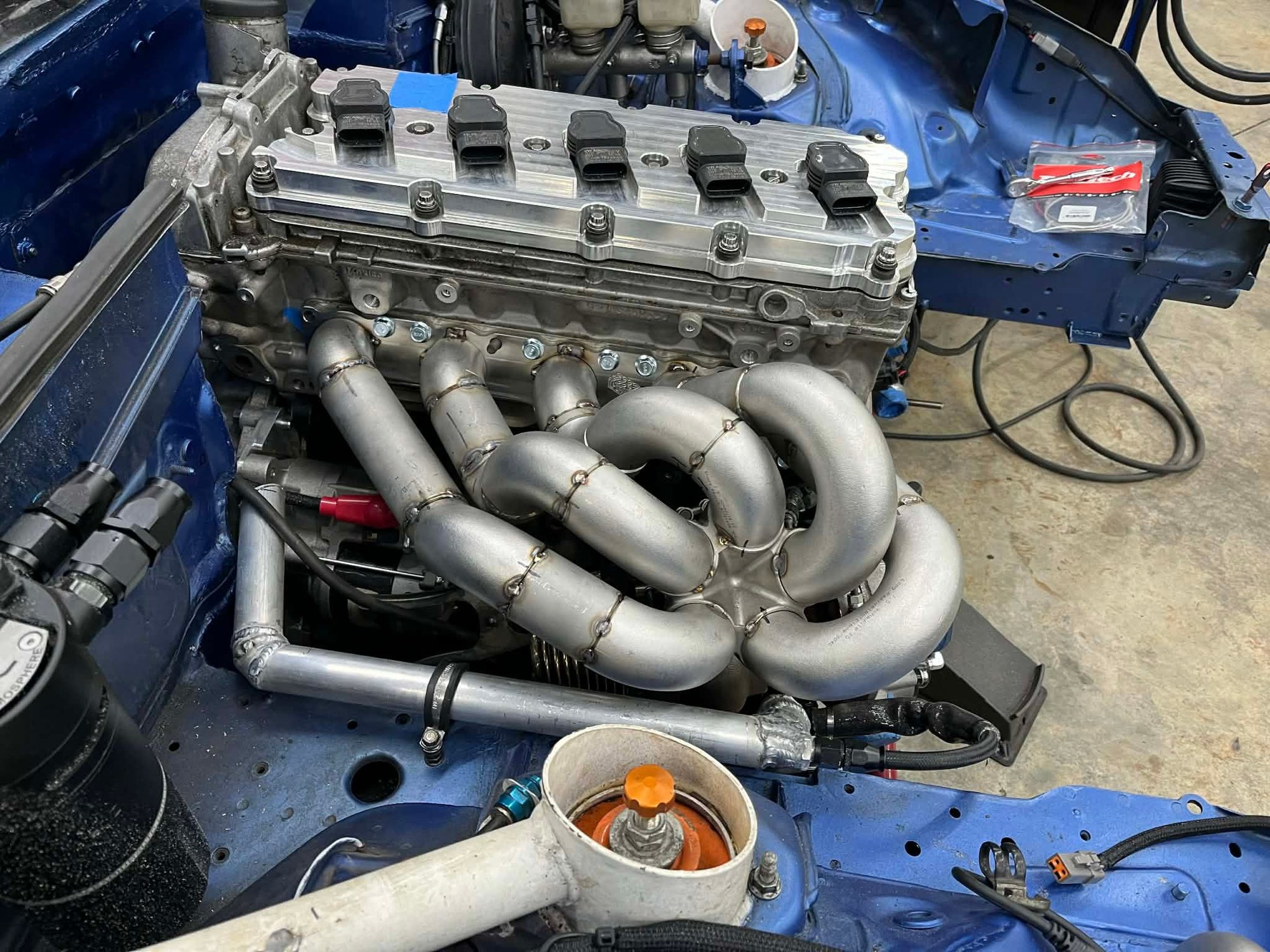 The transmission cooler wasn't plumbed yet, none of the exhaust has been built, the front coolers weren't installed yet, but I grabbed 10gal of E85, snugged up the 3 lines that hadn't been tightened and were leaking fuel, cranked to establish oil pressure and good crank signal, and fired it up.
