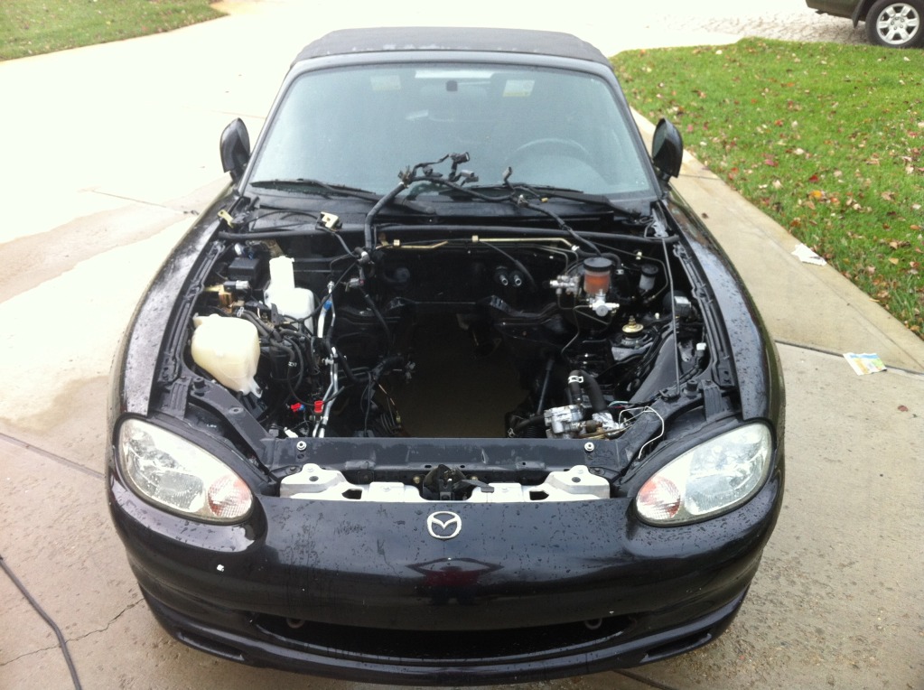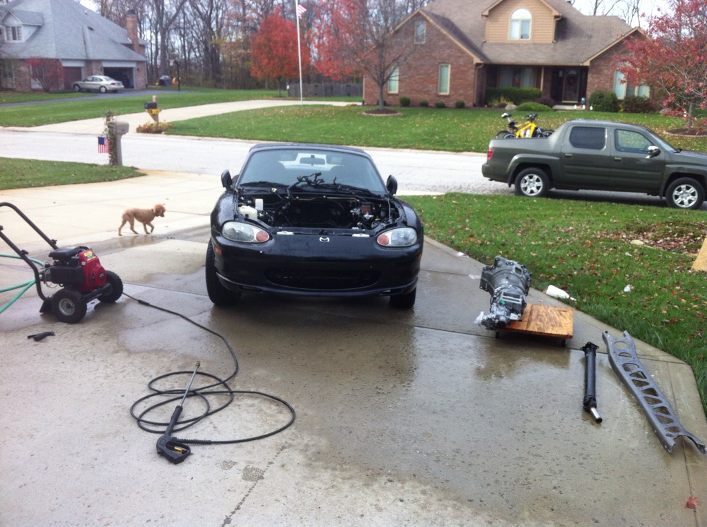 Started out with this clean stock 80k miles 99 sport from Chicago, the car has no body rust and some surface corrosion on the rear subframe and A arms that will get sandblasted and repainted when the suspension work gets dine next winter, the engine had a hole on the block and oil pan from a rod that decided to let go of the crank (suspect a broken main bolt)