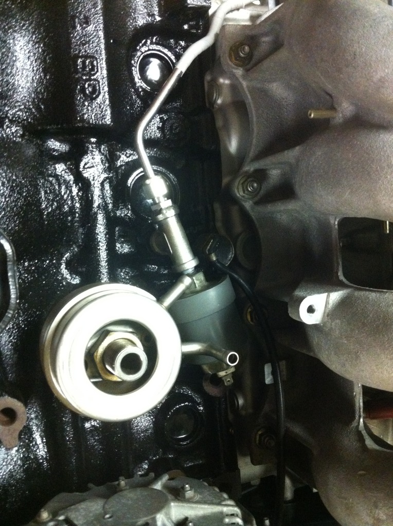 Why not hammer in a freeze plug and eliminate the front water neck? With the water temp sensor in the back of the head, I don't see a need for it. Also, that T fitting for the oil pressure sensor and oil feed is a big no no, they crack with the vibration. Run an -AN line to the firewall or over by the passenger coil over and T the two off that. Everything else looks great, looks like you've got some very nice fab skills.