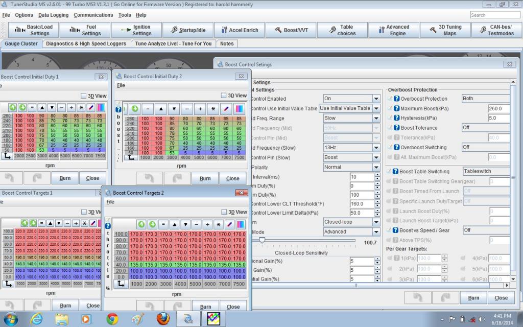 Aaron got ebc working well on table 1 but could not get table 2 to work, boost will oscillate on that table regardless of having high or low boost, hope to get that figured out and fixed because I want to be able to run 240hp or 280hp with a flip of a switch on the dash...