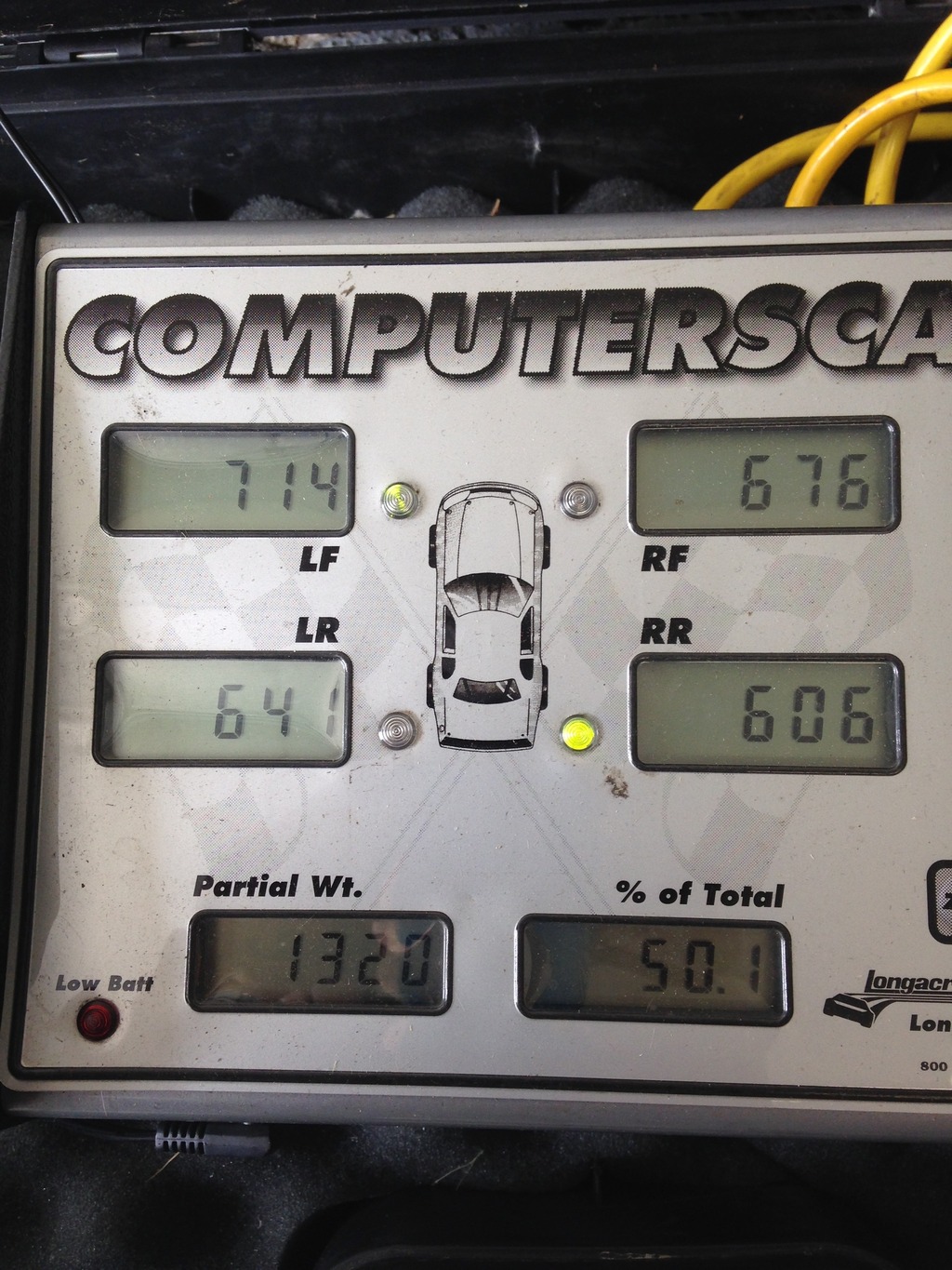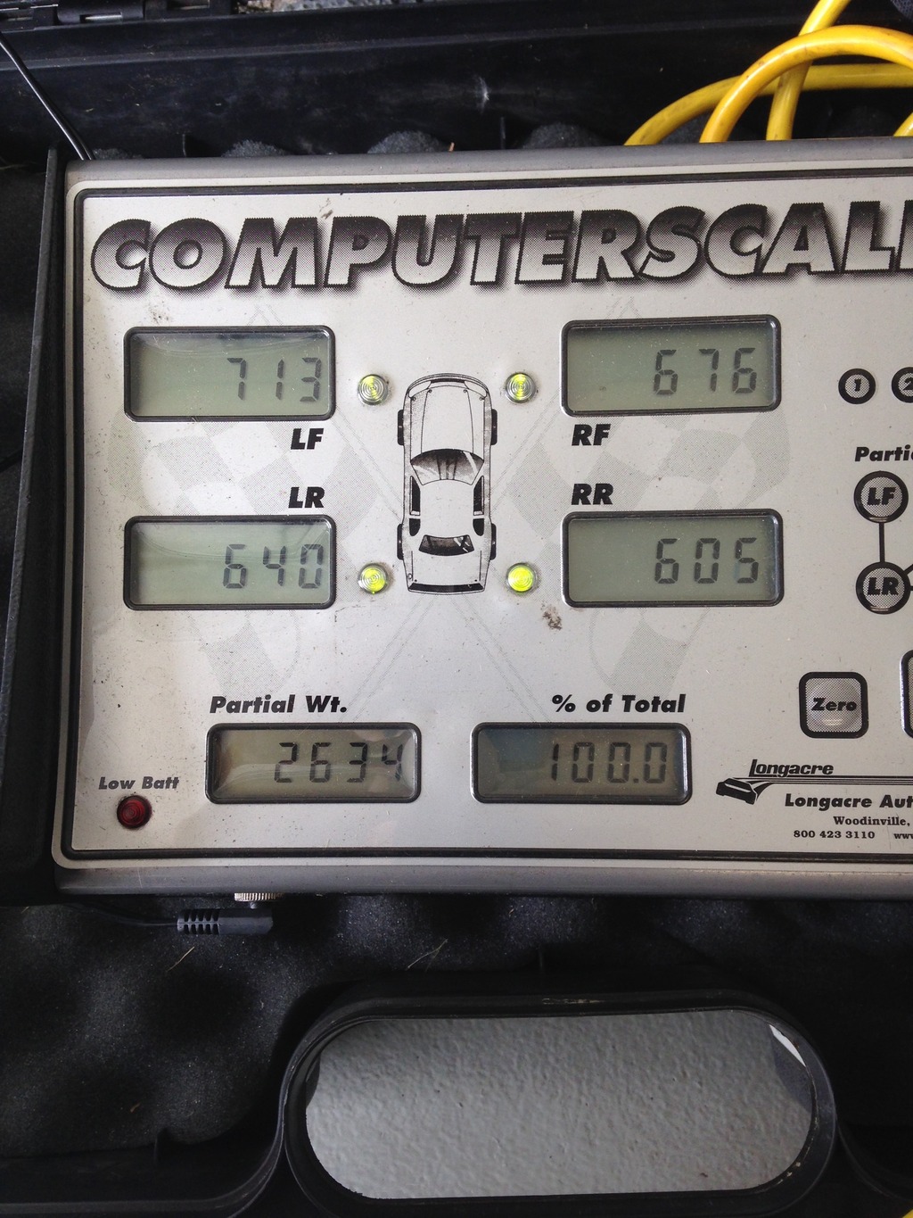 Got the car aligned yesterday, it is pretty porkey at 2634 lbs with 1/4 tank of gas, 219lbs of my lard on the drivers seat, ac, ps roll bar (no hard top)��