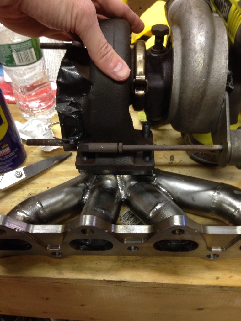 Drilled out the holes, lined things up and... one of the new stud holes is not even close to lined up right with the turbo. Options at this point seem pretty limited for the old manifold. I suppose I could spend some dough to have someone weld it up and put a new hole in there, but from what I've read this does not seem like a great option.