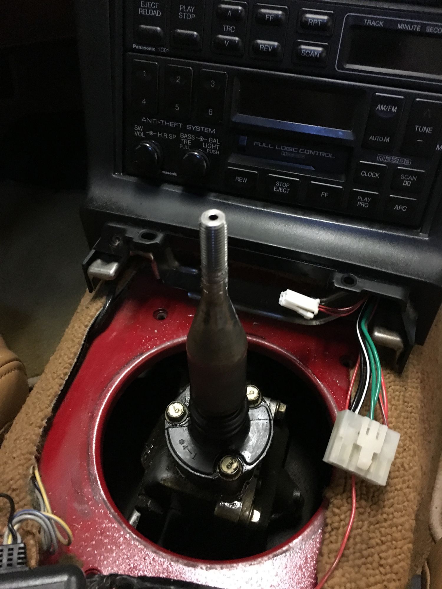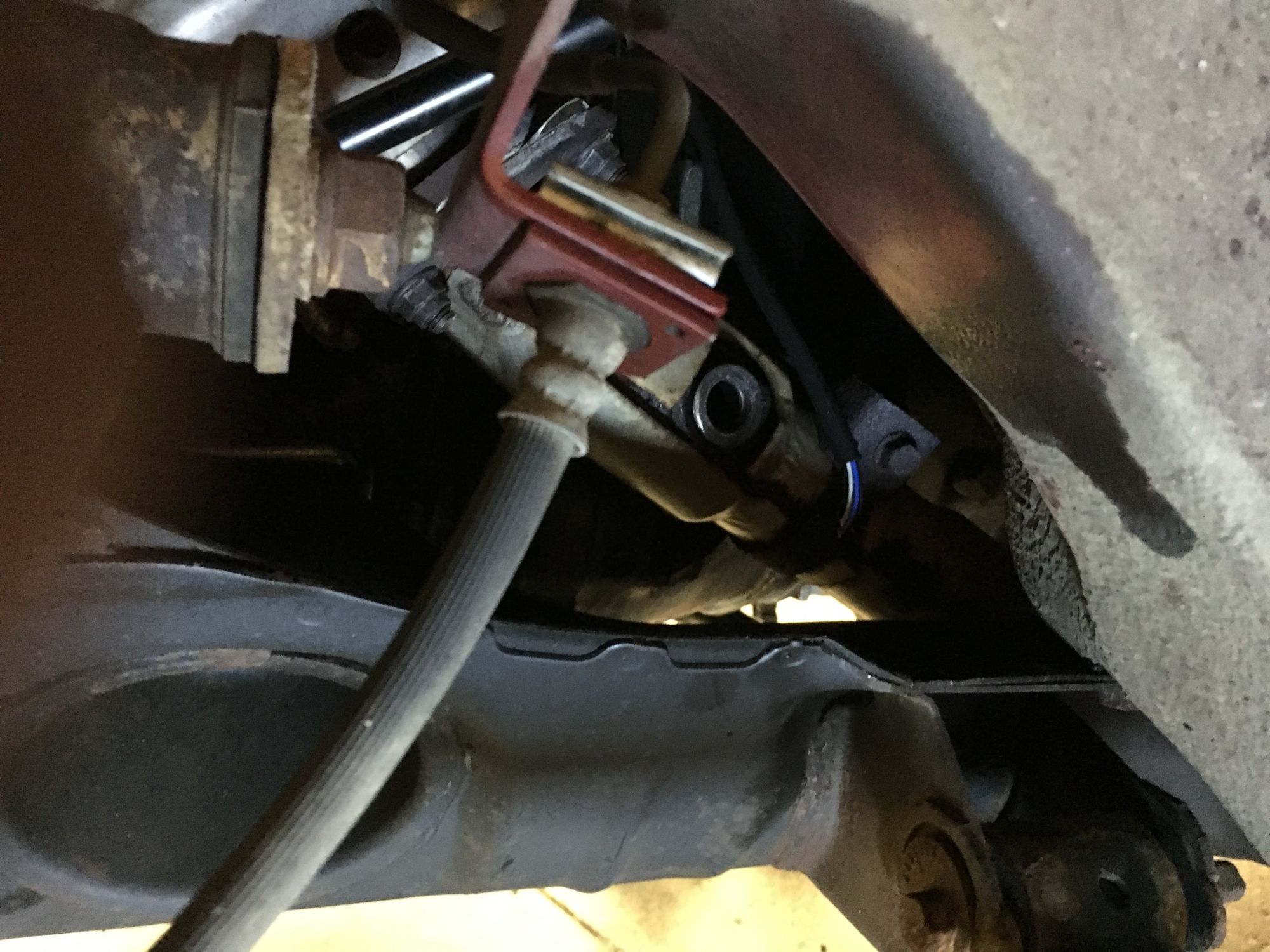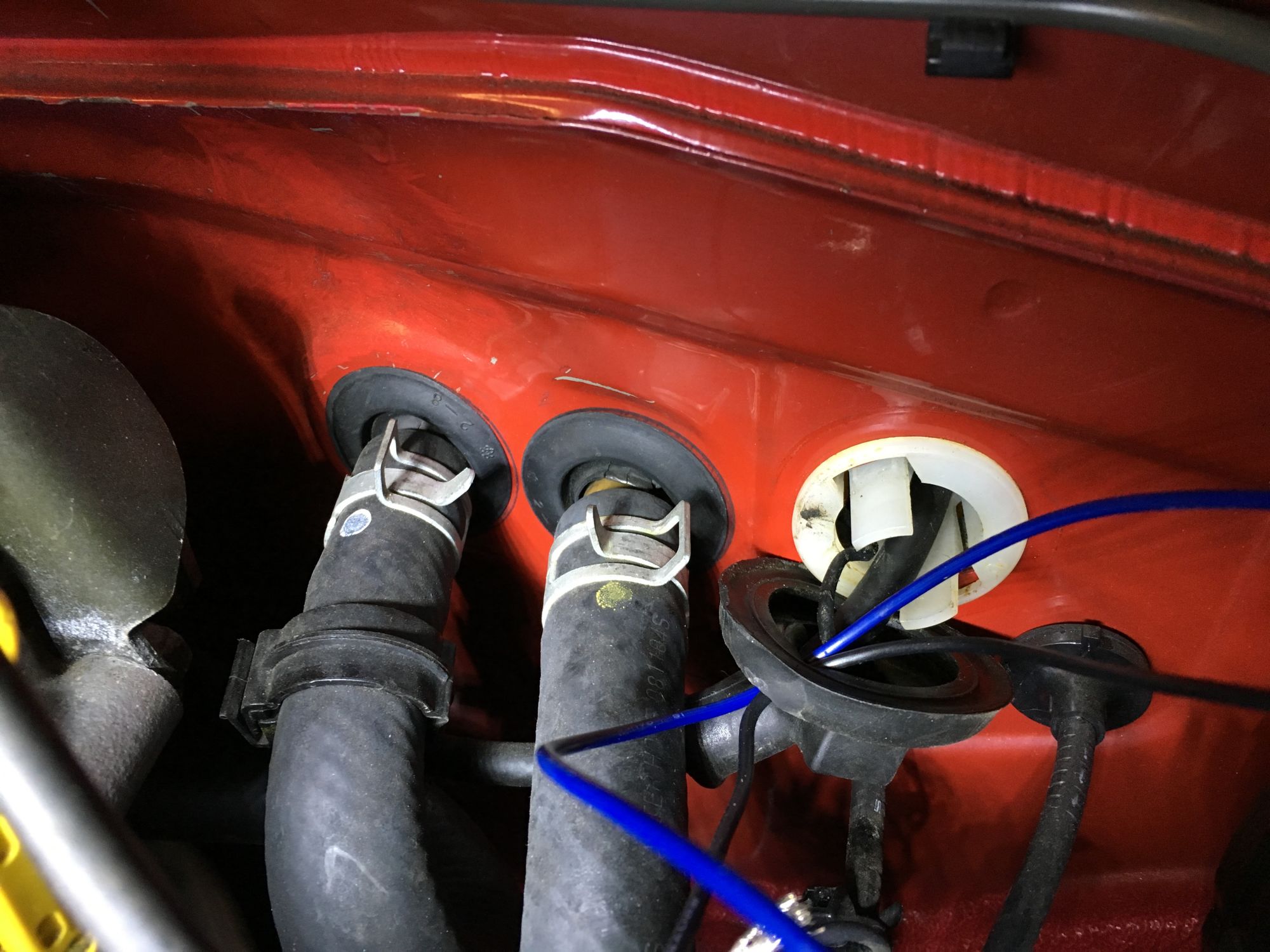 after screwing in the sensor, I ran the harness up along the transmission tunnel, and through the shifter into the cabin. Then I extended the signal wire (white wire on the AEM harness, but as you can see I used blue wire to extend it into the engine bay), and the ground (black wire) through this rubber grommet back into the engine bay..