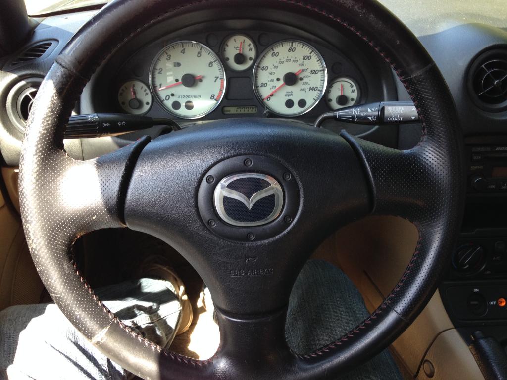 Until the shift boot and aux in wiring components come in, I've busied myself with a '05 MSM steering wheel. I like the perforated leather, and the air bag and rear plastic bits are in better shape. I also like that I've gotten rid of all the Nardi logos. F them. There's some damage from some tape applied by a PO on the top (purposefully cut off in photo), but otherwise this one's in better shape. Just gotta find a decent leather treatment and/or dye. I also replaced the e-brake plastics with bits from the MSM, as mine were a little sun faded. No pics, cause thats boring.