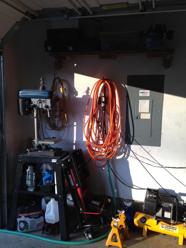 I'll start from the left side and go around. In this corner I've got my drill press, motorcycle lift (for sale), jack stands, compressor, and 90% of the MSM's AC system that I'm taking in for aluminum scrap recycling, and some sport brake dust shields I'm taking in for scrap. There's also a shelf with a few power tools, my electric RC car I never use, and a few other small things. Cause I built the shelf and I don't trust it. Inside the coil of air hose, you can see power strip #1 of 3, which powers the drill press, compressor, stereo, shop vac, and anything I use out side, with the picture yellow extension cord.