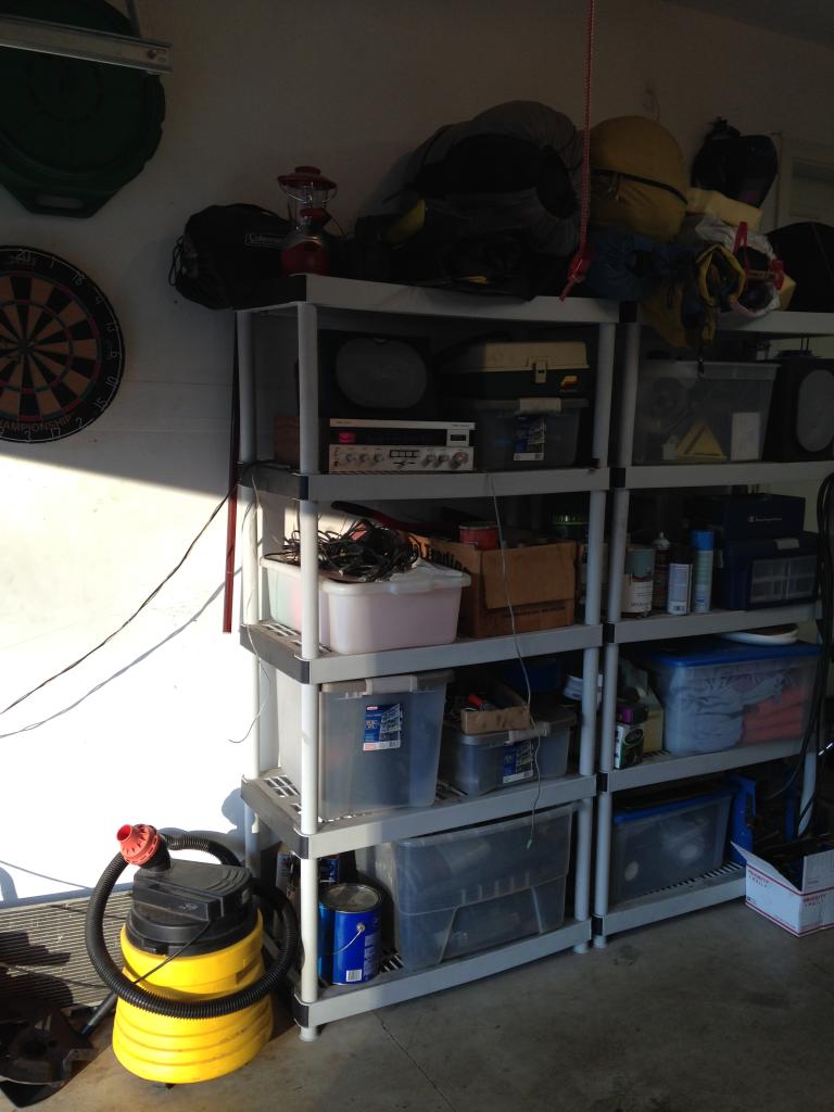 Then there's my dart board with my drain pan hanging over head, shop vac, and main storage shelves. They contain lots of Miata parts, my stereo, lots of fluids and cleaners, my nitro RC car I never use, my welder, and the top shelf is all camping gear we hardly use. Camping is NOT a vacation. Camping is work. Above the shelf hangs my welding helmet, and a toggle switch for our door bell, cause we used to work night shift, and **** UPS.