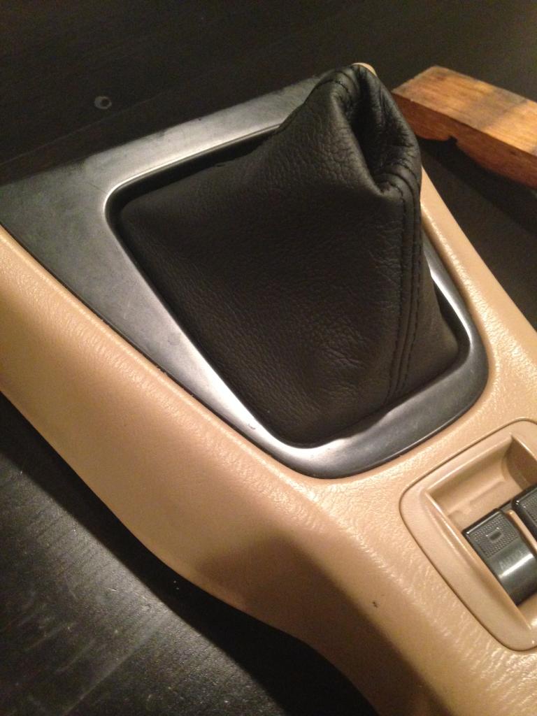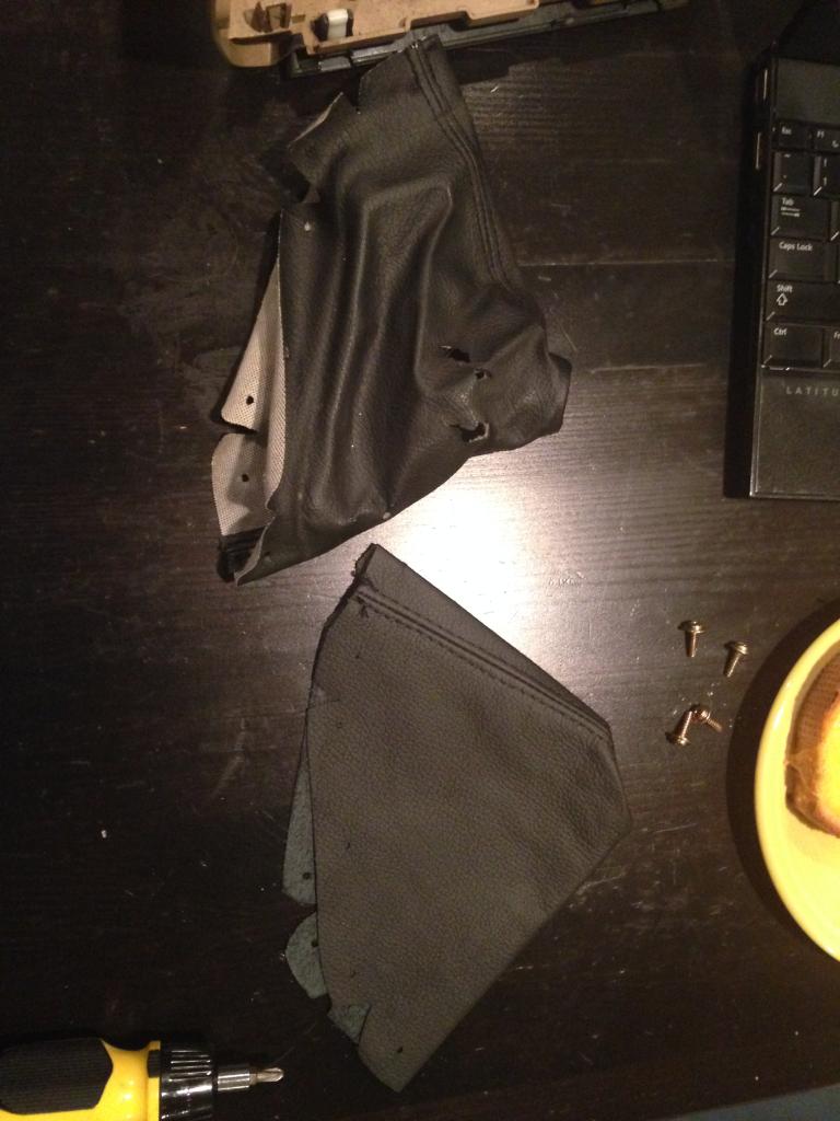 So I'm guessing the leather is of lower quality, but since the original had a bunch of holes and was hard and brittle from the exhaust heat through a broken rubber shift boot, that really doesn't matter.