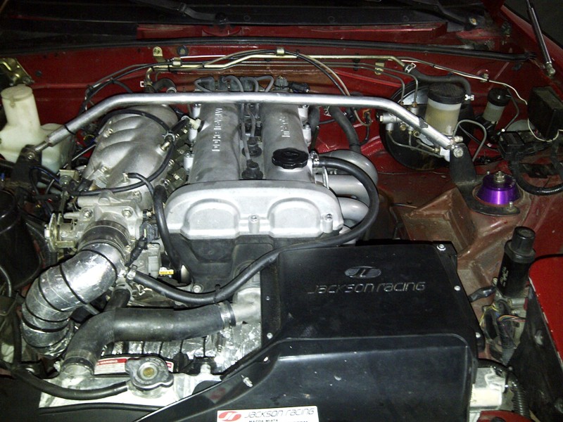 General layout. Ricer STB (someone on Craigslist will love this), FM tophats on the front?!?, Jackson Racing Intake. I'm looking forward to building my own intake and doing some Virtual Dyno comparisons. I'm sure I can do better than the JR with small diameter tubing and 360 degrees worth of flow direction change. Plus, I'll be able to seal up that radiator.