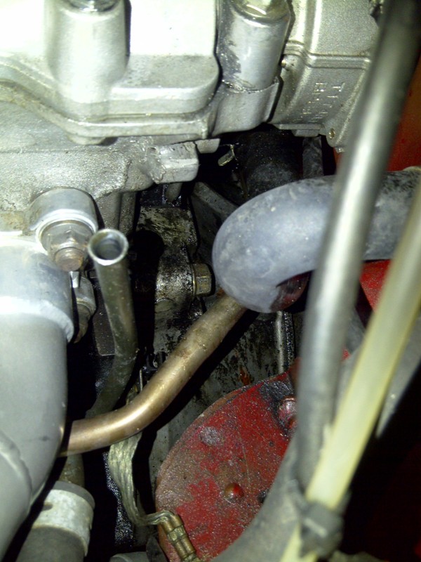 Lots of oil and clutch fluid at the back of the engine. Here's a shot of the curly-Q -- completely unsecured. I've got a braided line on order from TSE to get rid of this.