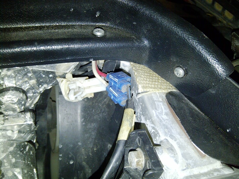 The "all fans on all the time" mod. Wiretaps used for high-amp loads. Yuck! OTOH, that's a nice FM aluminum radiator under there!