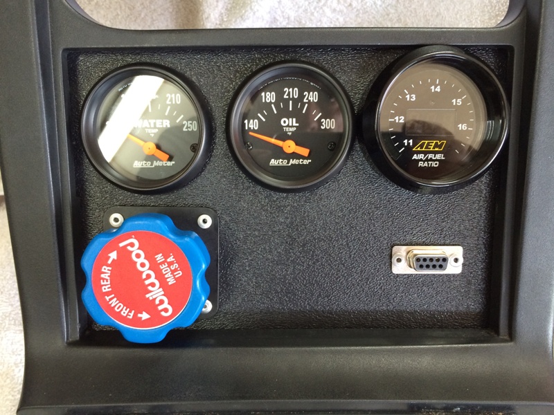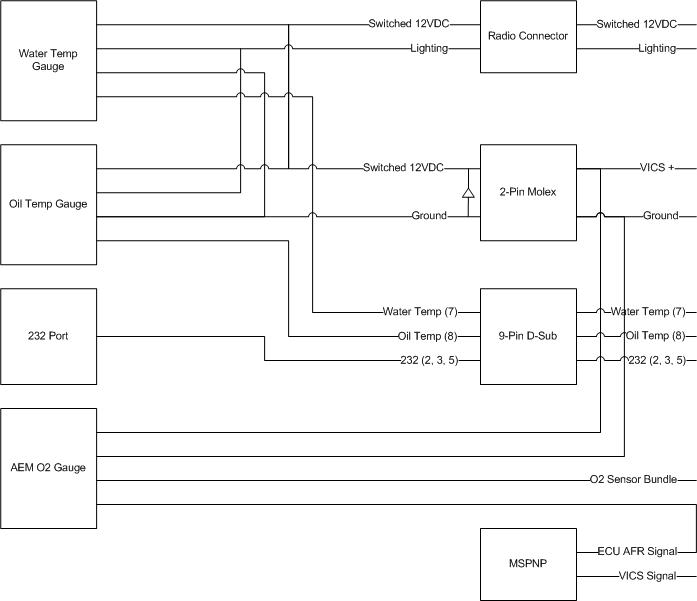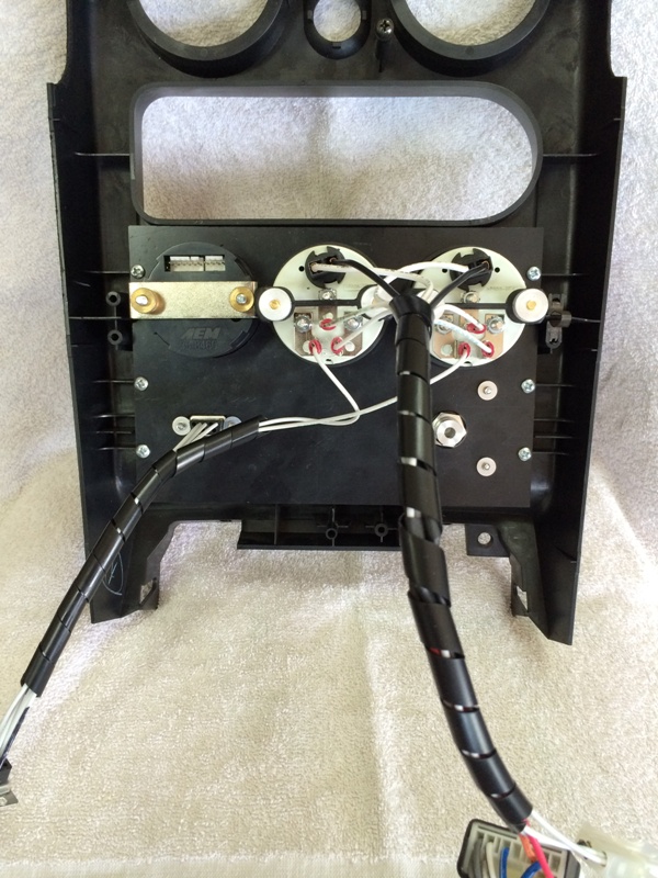 Business end of the pod. Connections to the car are through the OEM radio plug (for switched power and illumination), a 2-pin Molex (ECU ground and power for the VICS and AEM gauge), and a 9-pin D-sub (MS RS-232, Oil Temp Sensor and Water Temp Sensor):