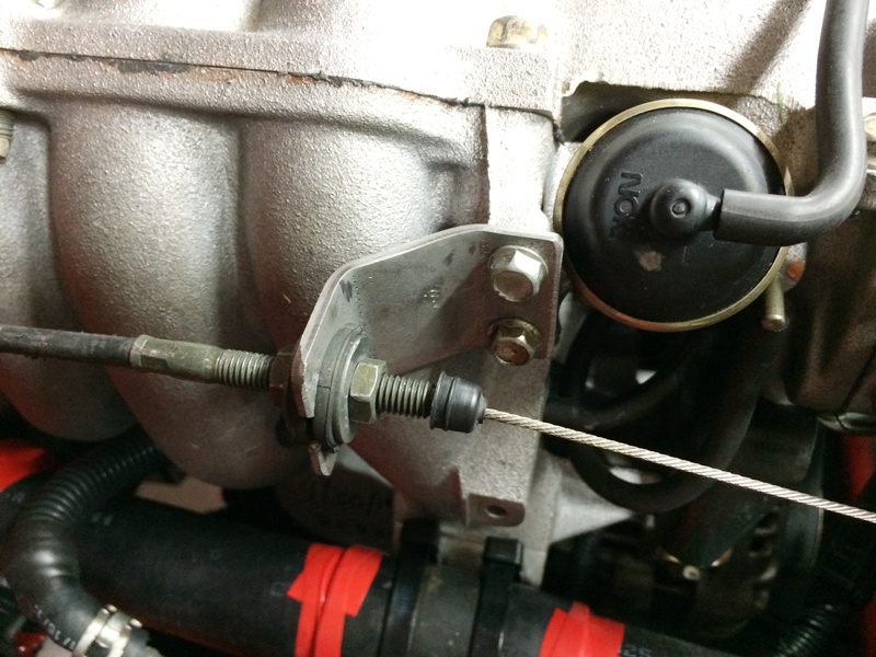 Bent up a throttle bracket to use the '95 throttle cable on the '99 head/IM. PO had used OEM '95 bracket and spaced it out with some nuts. Didn't like that.