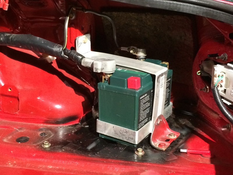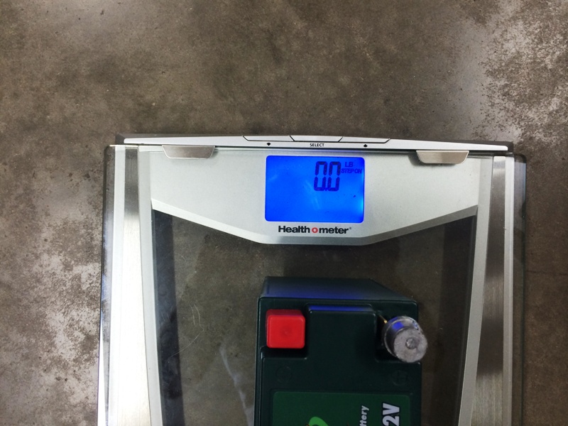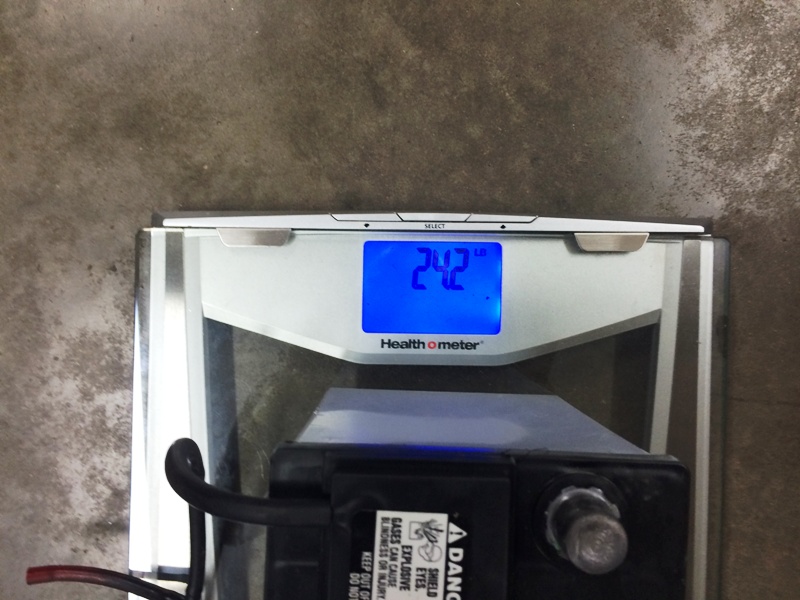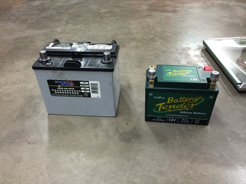 Big weight reduction win. Replaced the AGM battery with a Battery Tender brand Lithium Ion battery (http://www.summitracing.com/parts/dt...300c/overview/). Saves about 22 pounds. When you pick up the Lithium Ion battery, you would swear it's made from styrofoam. It didn't even register on the bathroom scale (Summit says 2.1 pounds).