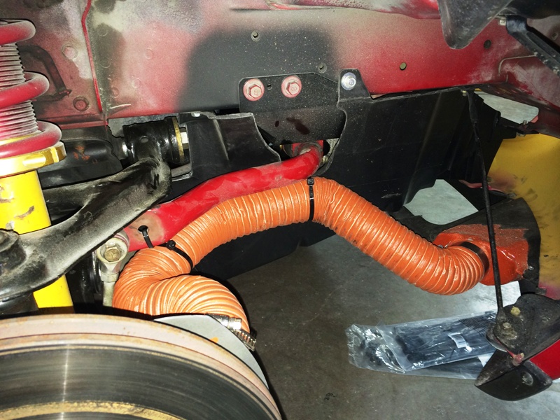 Brakes ducted. This picture also shows the heavy duty sway bar mounts. I need to seal the tow hook cutout in the OEM air guide -- a bit of foam should do it.