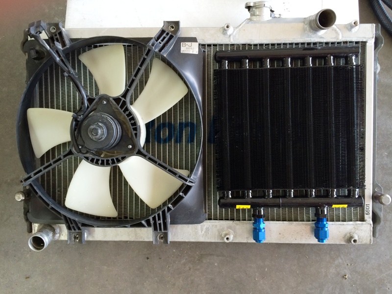 Plan is to mount it to the radiator in place of the AC fan. The AC fan mounting bosses will be re-used for this. The order of heat exchangers follows good engineering practice (cooler fluid in front, warmer fluid in back).
