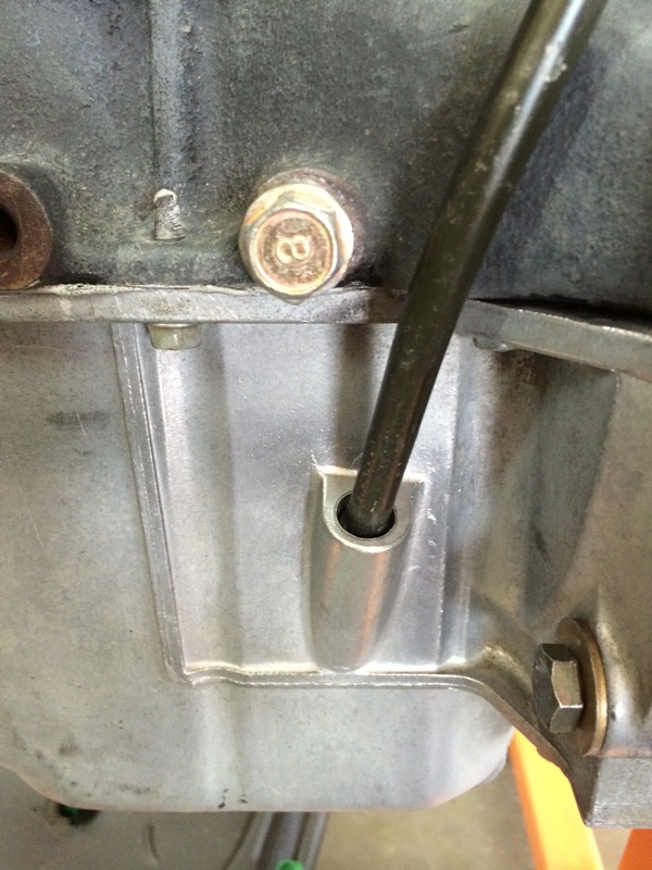 Cleaned up the RTV mess around the dipstick. When I removed the dipstick, I found a dried-out, flatenned O-ring. Replaced that.