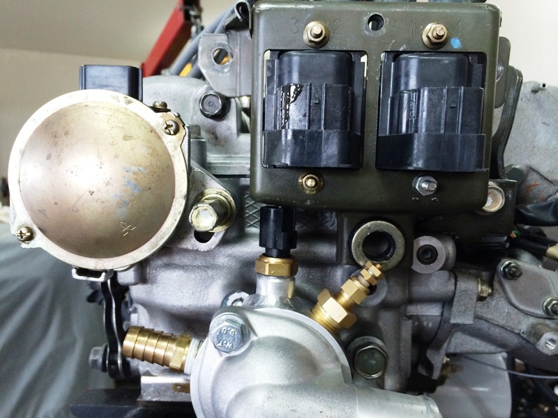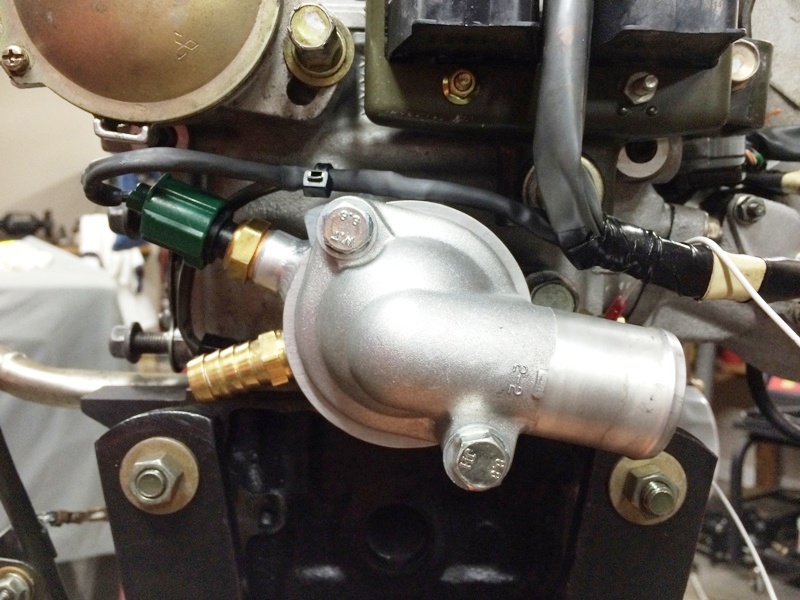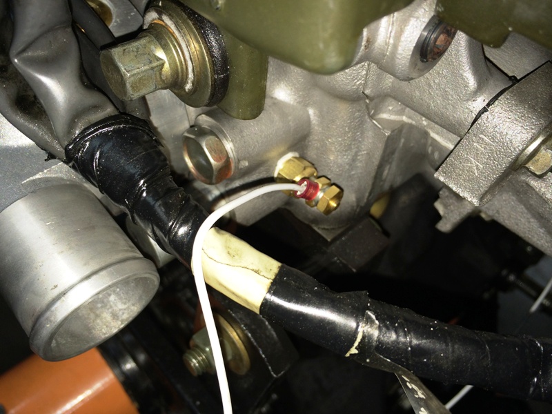 As for the new water temperature gauge sensor, I drilled and tapped the head for that. The outlet for the OEM water-oil heat exchanger (under the wire bundle in the picture) was plugged with a 1/4-28 set screw and JB Weld and then covered with a rubber plug from a 1.6 (i.e., "cursed water plug").