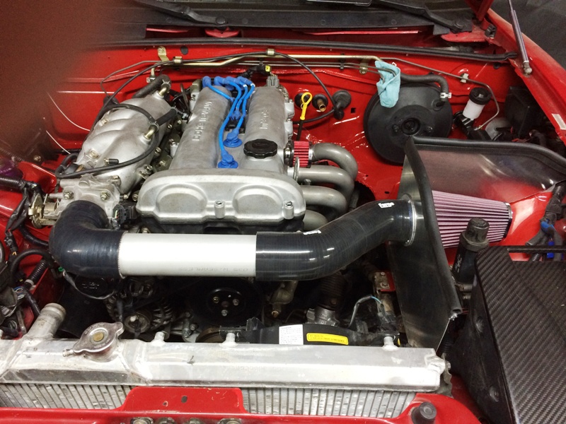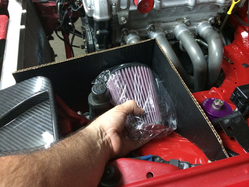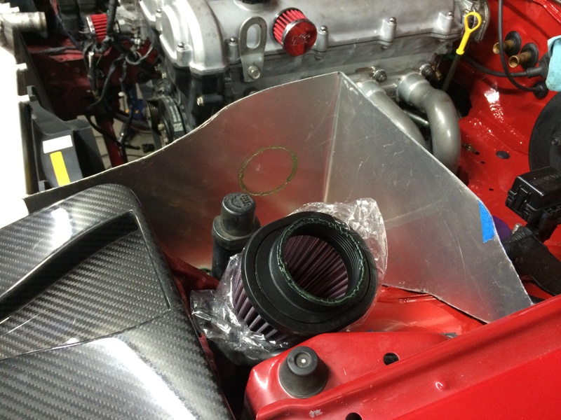 90 degree silicone elbow ==> straight aluminum tube ==> a bit of SCEET for engine movement ==> K&N mounted in airbox fed by headlight lid. All 2.5" KISS. Should be a lot more maintanable and flow better than that JR CAI monstrosity that was on the car.