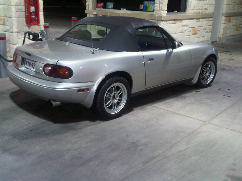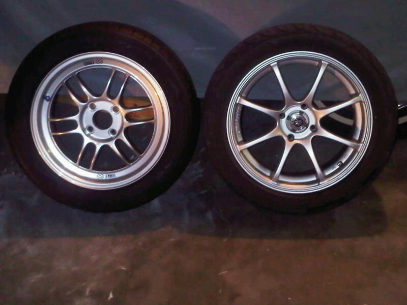 3. I recently developed a vibration. Turns out, I bent the inside rims of the 2 passenger-side Konig's (probably from being too apex aggressive). So, I upgraded to the high-strength rims that I really wanted all along. Enkei RPF1s (15x7). To keep my Dad happy (retired from BFG), got BFG G-Force Sports in 205/50R15. Brand new with more rubber, this combo came in at exactly the same weight as the worn Konig/S-Drives.