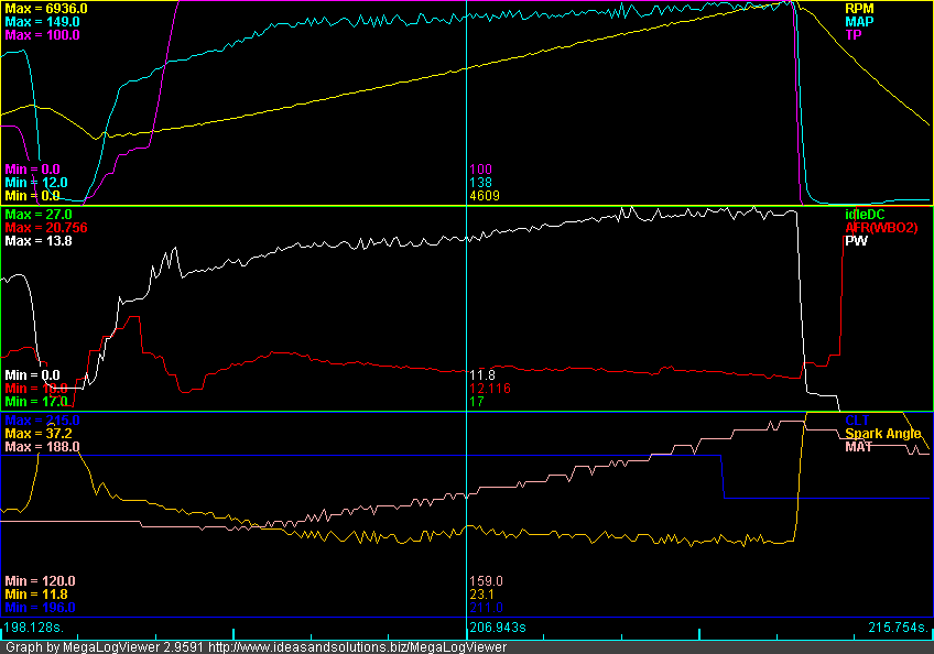 Tuning the valve duty cycles is straightforward. What I did was log a series of third gear pulls with my entire duty cycle table set to a contant value. I would do the third gear pull until I either hit my RPM limit or my boost limit. This was my sequence: