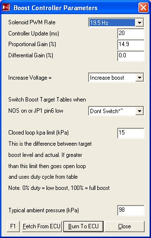 I setup my target boost table, and left the default values for Proportional Gain (49.8%), Differential Gain (9.8%) and Closed Loop kPa Limit (20kPa). Did a 3rd gear pull. It wasn't pretty (±3psi), but it was obviously controlling. Time to tune.