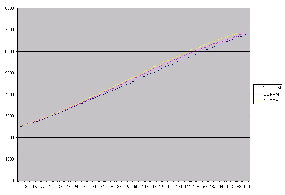Here's a comparison of the three control methods in RPM vs. Time. Note that time is in MS logging frequency units (~16Hz -- a value of 160 is about 10 seconds). The lines are 2500RPM to 6900RPM pulls. The steeper the line, the faster the acceleration. More boost = more power . . . no suprise here.