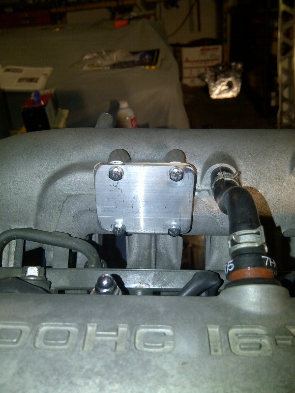 I deleted all of the little coolant hoses that run around the engine and blocked everything with pipe plugs. Here's the blocked-off air valve (just a piece of 2" x 1/8" aluminum stock from Home Depot with a cardboard gasket) -- there's been no change in cold-start driveability with the air valve delete:
