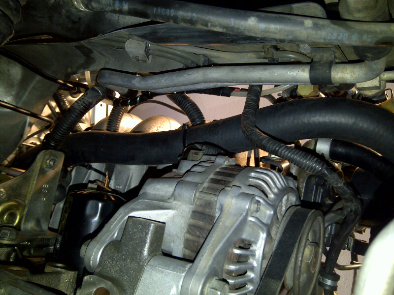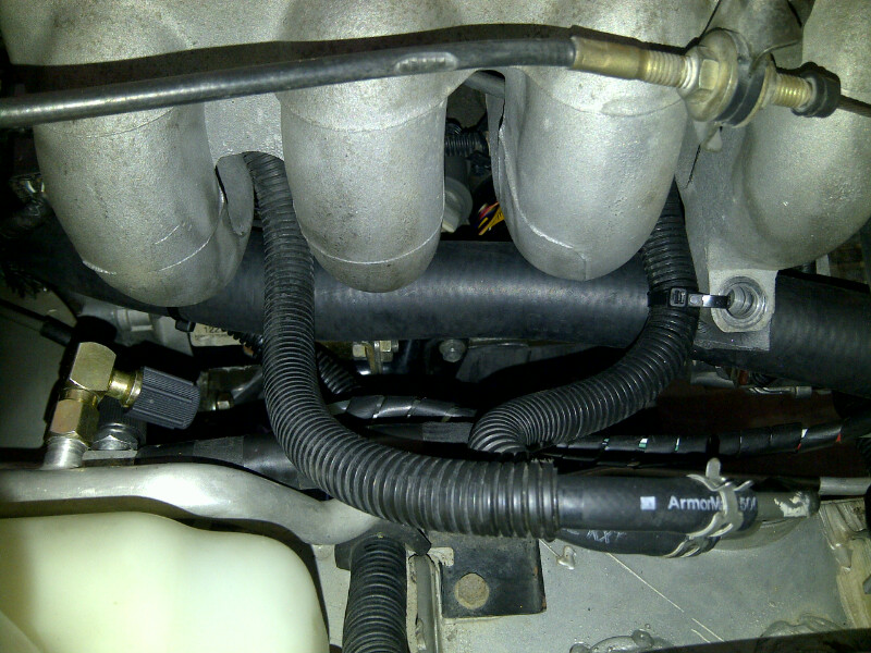 These pictures show the routing of the GM truck hose. I cut about 3.5" off the end at the back of the engine, and close to 5" off at the radiator end. The hose is secured to the intake manifold at the #1 and #4 runners. The hose came with some snakeskin that I positioned between the firewall and the flexible clutch line. Fit and chassis clearance were good and I don't expect chaffing. We'll see: