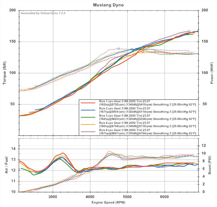 I'm going to Hallet next weekend so my projects this week are to foamectomy both seats, mount my fire extinguisher and secure the exhaust. After Hallet, I'm going to mount a BEGI downpipe and 2.5" Enthuza that I picked up for cheap ($300 for both). To establish my current power at 10psi, I did some 3rd gear Virtual Dyno pulls last night: