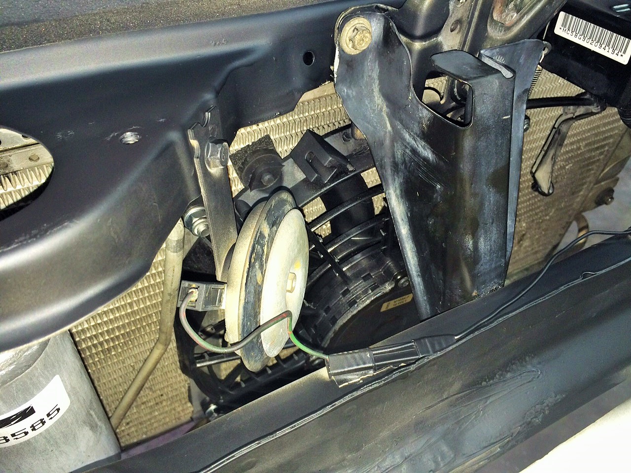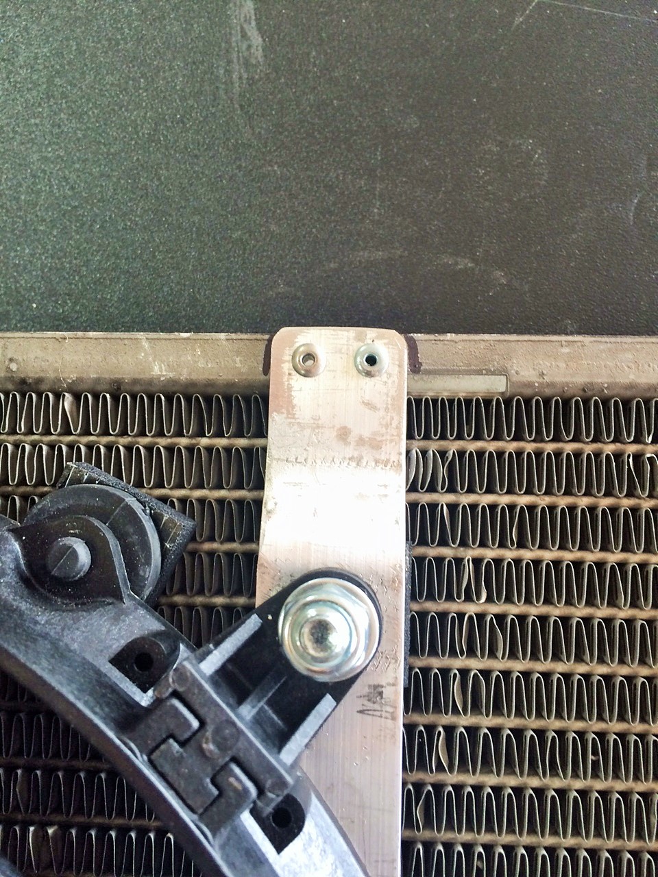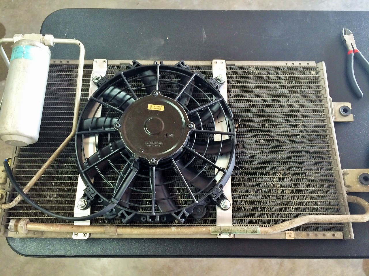 Since I'm running AC, I still need an AC fan. I bought a JEGS-brand heavy duty slim fan (JEGS Performance Products 52160, JEGS Low Profile Heavy Duty Electric Fans | JEGS Performance Products) and mounted it to the condenser in pusher configuration. On my wife's MB, having a pusher fan mounted directly to the condenser was effective for AC cooling when sitting. Previously, the Miata provided almost no AC cooling unless I had forward movement. This fan is too powerful to zip mount to the core (as if I would ever do something like that anyway), so I used aluminum strap to mount to the condenser. I also replaced the 1990 condenser with the 1995 condenser from the Red car to work better with R-134A. Mounting details: