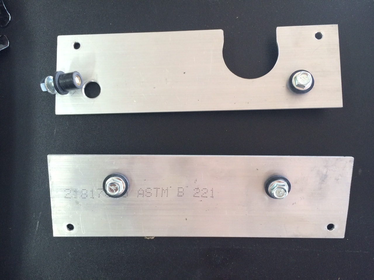 I'm applying lessons learned from the Red car, and am adding a big Tru-Cool oil cooler from Racer Parts Wholesale. These are inexpensive and effective. Built brackets to mount in the AC fan spot. These are 1/8" x 3" aluminum with rubber wellnuts to mount the oil cooler and provide vibration isolation: