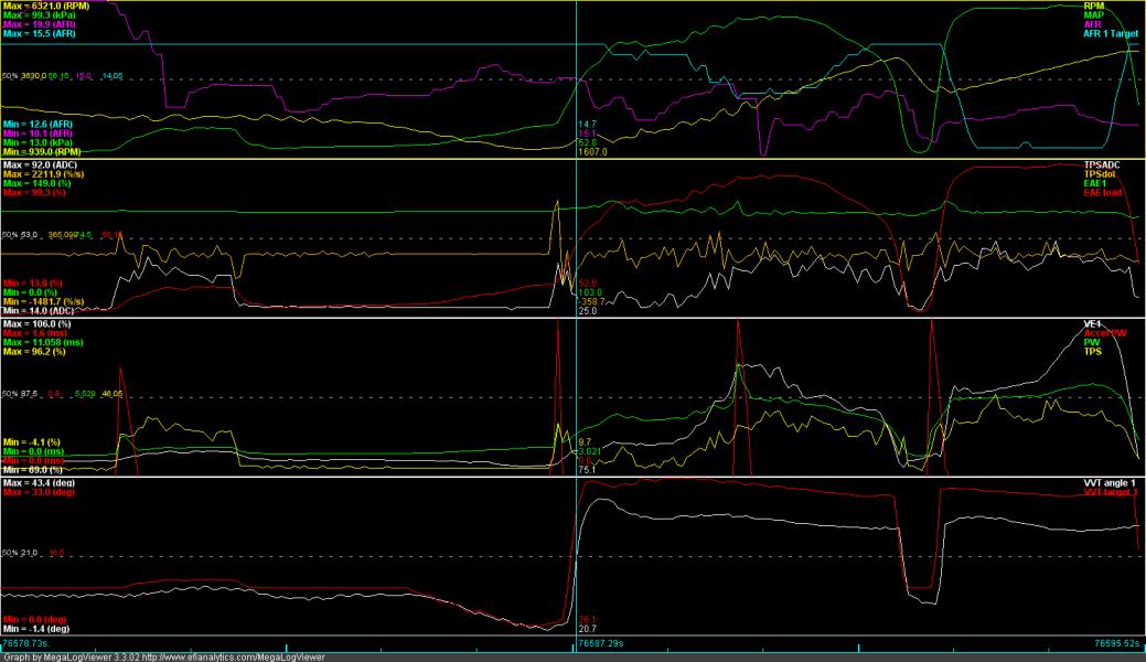 VVT is "kicked-in" from 1800rpm on, but it sounds like an old Honda B engine. I tried a 25* range to get rid of the dip out of the VE table, but there was no success. From the driver's seat, you would not guess the VE table looked like that.