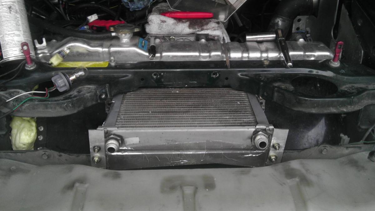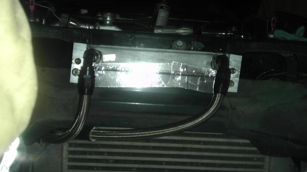 I may be able to trip the crash bar and fit the oil cooler on top, briding the gap of the intercooler-radiator, then cut a hole for dutcting and BAM!, car runs cool and I continue winning at life. I hope it works because I'm running out of energy and tired of not using proper tools. I need a drill press, band saw, and circular saw at the least. Instead I have a 1-car garage and tears. This is oil cooler revision #6.