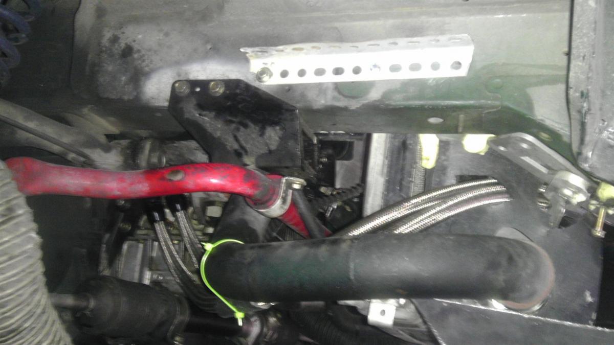 Oil cooler mount is done. I'm pretty happy with it. This is something like the 5th iteration of an oil cooler on my car, and finally I have one that I'm proud of. Now I have to make mounts for the lower duct piece, make a new belly pan, put the head on, make fuel lines, and see what happens.