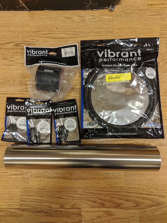 Some of the last required bits are starting to roll their way into the door. Fuel adapter hose and fittings along with some intake couplers and piping (even though I haven't the slightest idea on how I want to run the intake yet. That's a topic of discussion in and of itself.