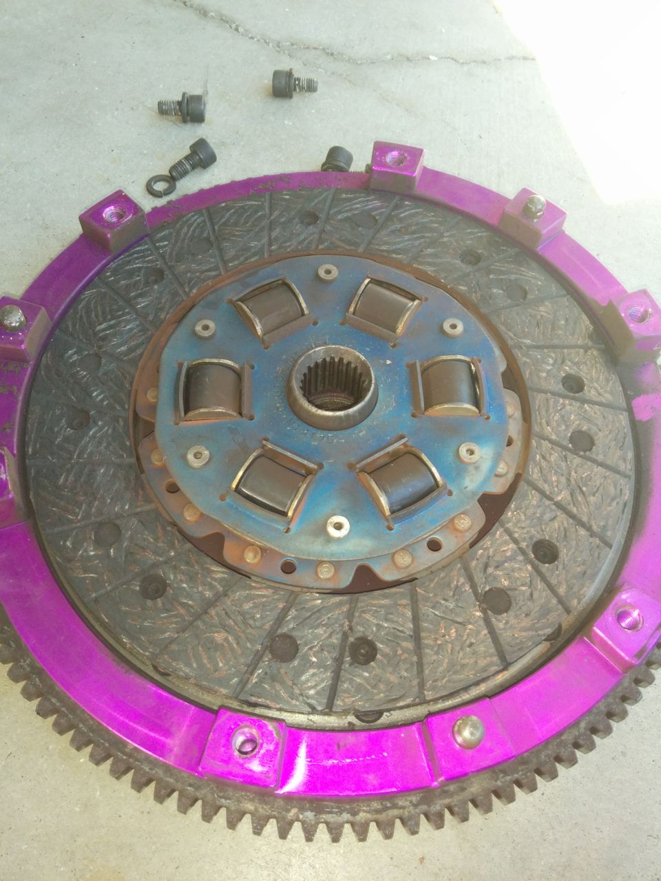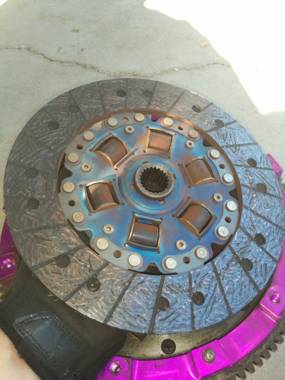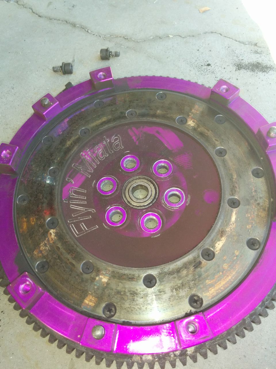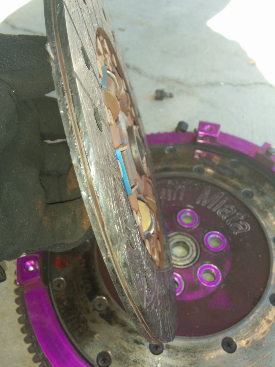 The pressure plate kind of looks like Jupiter... http://www.codrus.com/miata/teardown/clutch1.jpg Grooves in the clutch disc are still visible. http://www.codrus.com/miata/teardown/clutch2.jpg http://www.codrus.com/miata/teardown/clutch3.jpg http://www.codrus.com/miata/teardown/clutch4.jpg More gas giant storms on the old 9.5 pound aluminum FM flywheel. Need to find someone who sells the inserts for these. http://www.codrus.com/miata/teardown/clutch5.jpg --Ian |