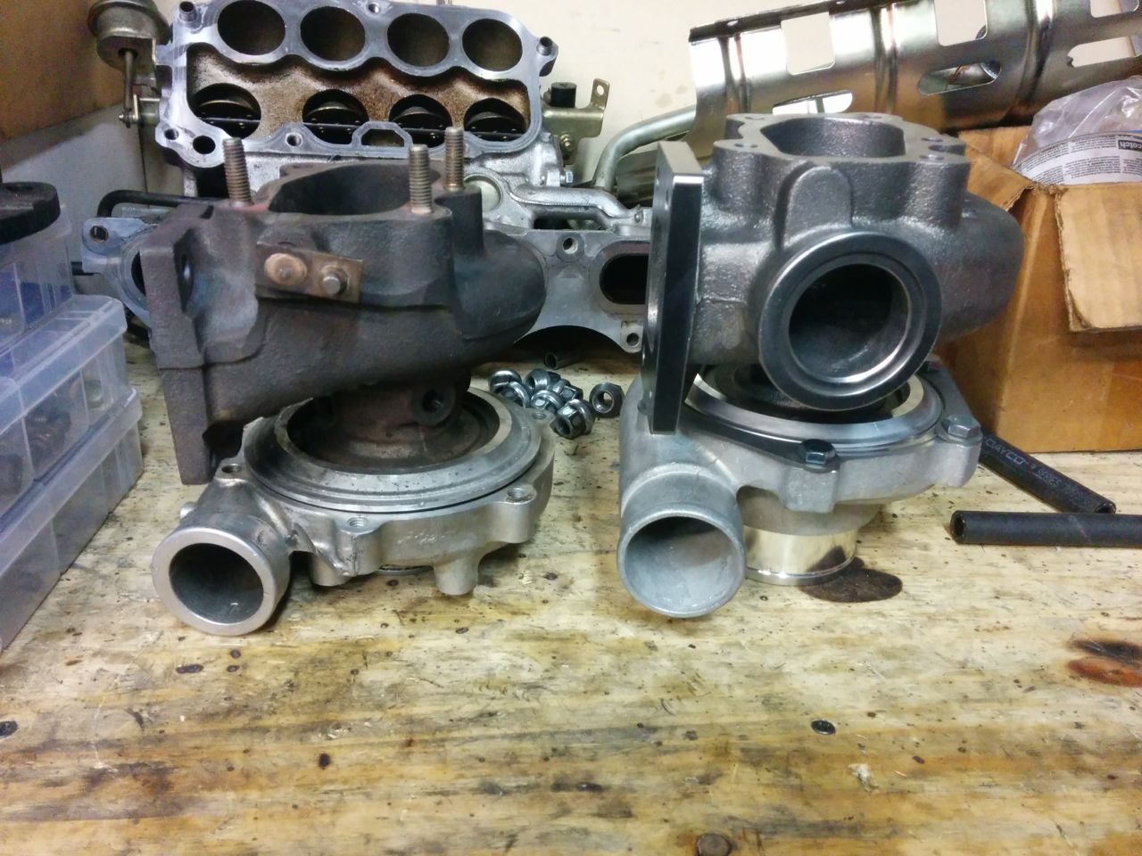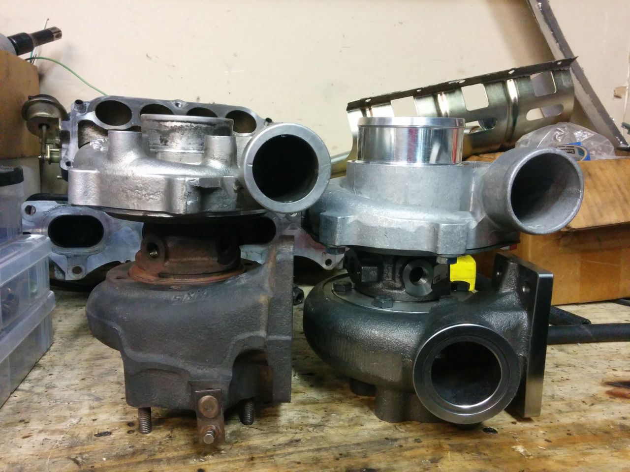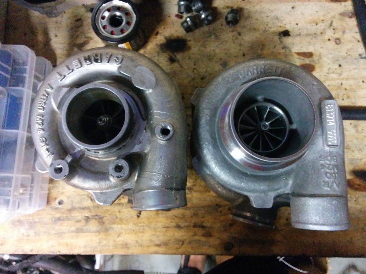 The 2863 drop-shipped from ATP, and got here in 1 day, yay. http://www.codrus.com/miata/teardown/new-trubo1.jpg Obligatory cat-and-turbo shot (my 14-year-old cat Smoke). http://www.codrus.com/miata/teardown/new-trubo2.jpg Comparing the 2560 and 2863. The turbine housing is noticeably larger: http://www.codrus.com/miata/teardown/new-trubo3.jpg The compressor housing not so much. It's almost exactly the same diameter as the 2560, I'm kind of surprised. I guess I probably won't need to carve up the frame any more. http://www.codrus.com/miata/teardown/new-trubo5.jpg http://www.codrus.com/miata/teardown/new-trubo4.jpg http://www.codrus.com/miata/teardown/new-trubo6.jpg --Ian |