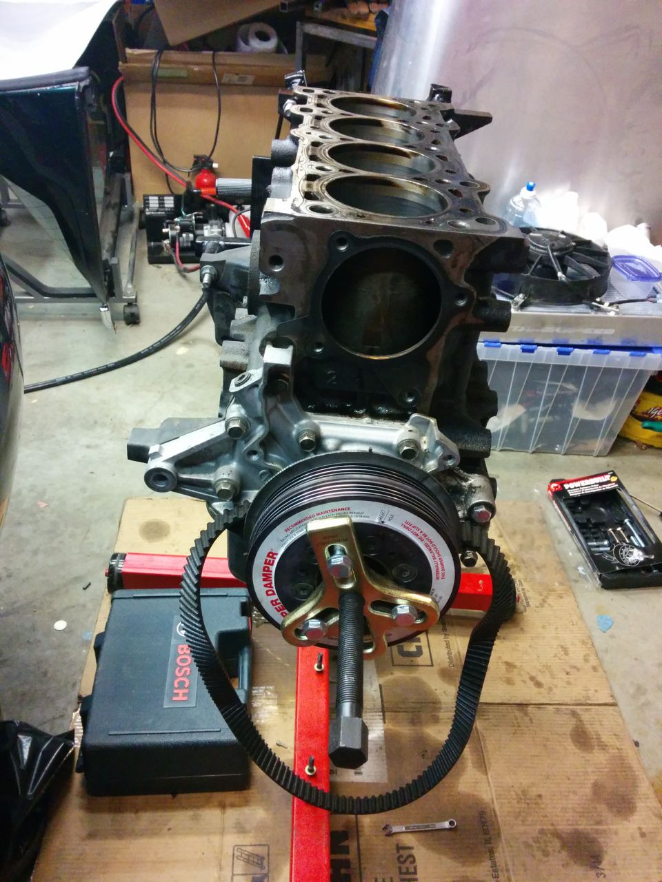 I forgot to write down the bolt length before installing them, so they need to be replaced. I have new rod bolts on order already. Tried to get the ATI super damper off today. Argh, stupid *&^%ing thing will NOT come off, I managed to break the head off one of the puller bolts trying. That's recessed into the damper, so I guess I'm done with that for now. I'm taking it the block to the machinist next week -- I guess I'll see if he can get it off. --Ian |